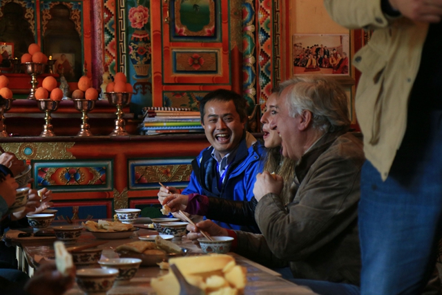 听了卓玛介绍,埃力克一个客房一个客户地参观,看到客房里的西式木床和藏式装饰,不时伸出大拇指点赞,并与来自日本广播协会记者高木优、埃菲社记者帕萝玛等人一起在藏式风味浓郁的卓玛家吃了午饭,开心品尝地道的藏餐。