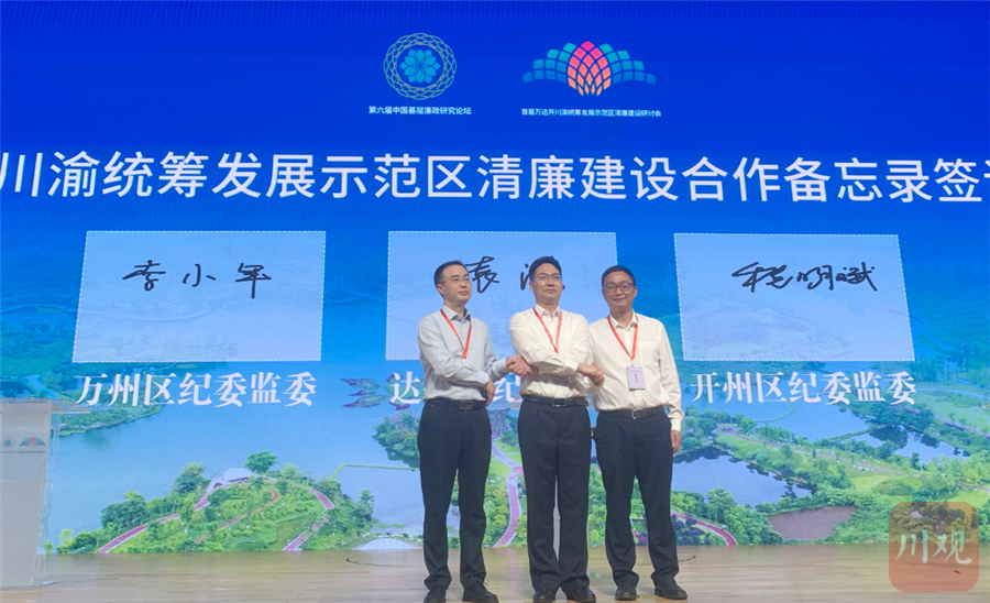 作为本届论坛暨研讨会的重要成果之一,四川省达州市、重庆市万州区、重庆市开州区三地在开幕式现场签署了《万达开川渝统筹发展示范区清廉建设合作备忘录》,就加强区域清廉建设涉及的合作会议、业务交流、协同监督、问题协作整改、案件查办协作交流、廉政风险联防联控、清廉文化共建共享、干部职工常态互动等事项达成共识。