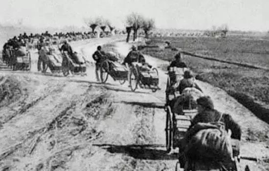 淮海战役中,中原人民支援我军弹药、物品的架子车队。