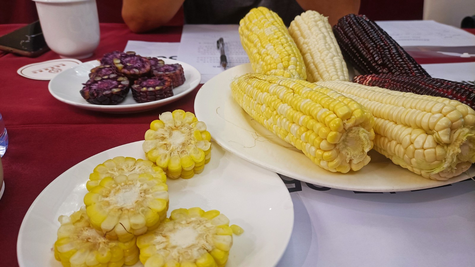 白色、黄白相间、紫色三个品种玉米经蒸煮后进行品鉴。