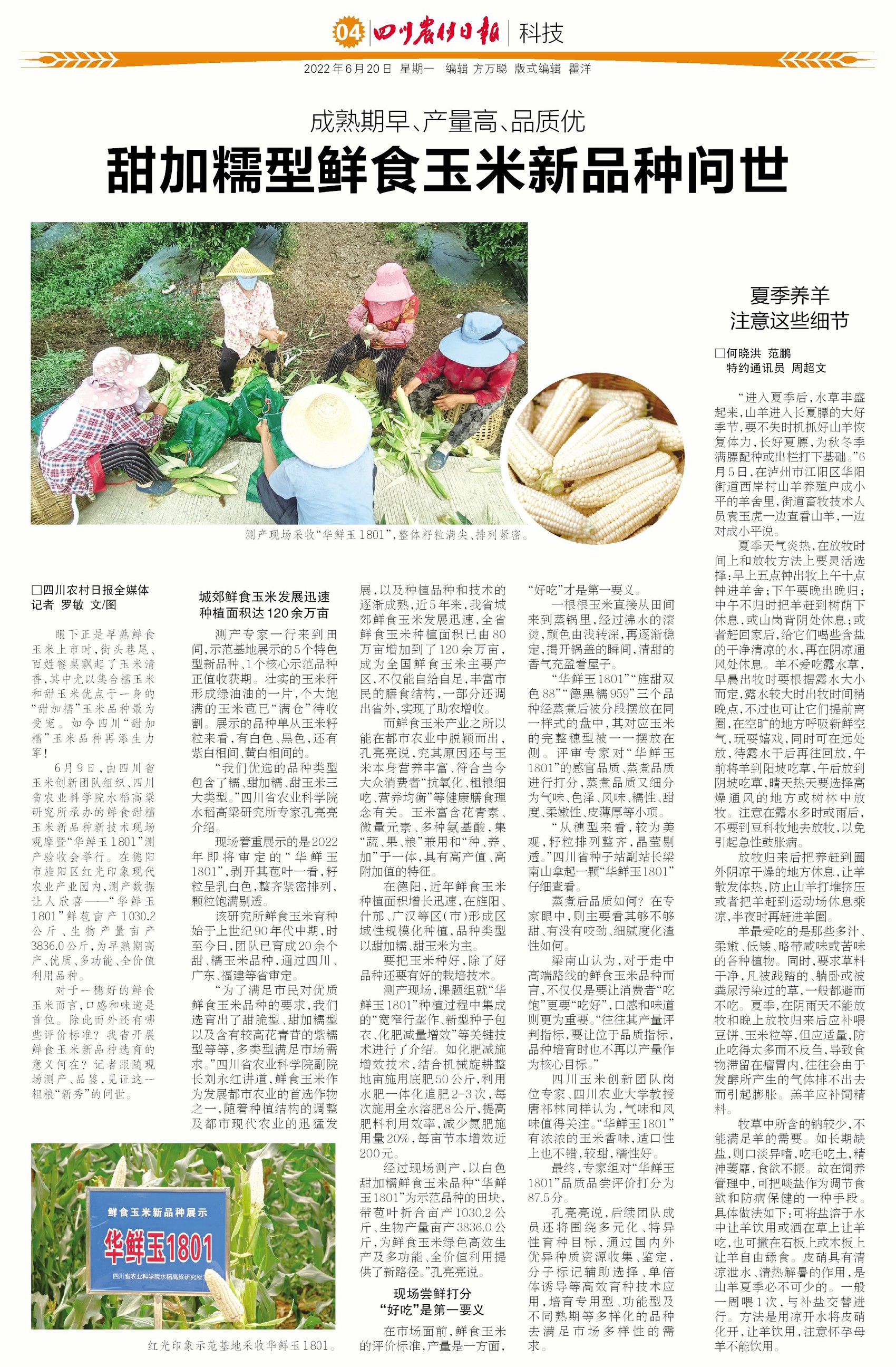 6月9日,由四川省玉米创新团队组织、四川省农业科学院水稻高粱研究所承办的鲜食甜糯玉米新品种新技术现场观摩暨“华鲜玉1801”测产验收会举行。在德阳市旌阳区红光印象现代农业产业园内,测产数据让人欣喜——“华鲜玉1801”鲜苞亩产 1030.2公 斤 、生物产量亩产3836.0公斤,为早熟期高产、优质、多功能、全价值利用品种。