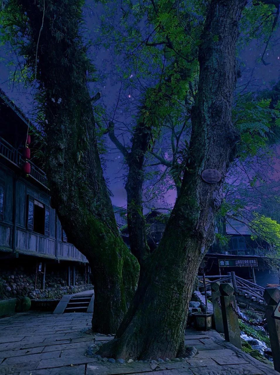 一座座古朴的木板房吊脚楼依着根枝盘错的黄葛古树,木板房半边街的尽头,连接着一条石板长街,不着一字,尽现街道的沧桑古朴。