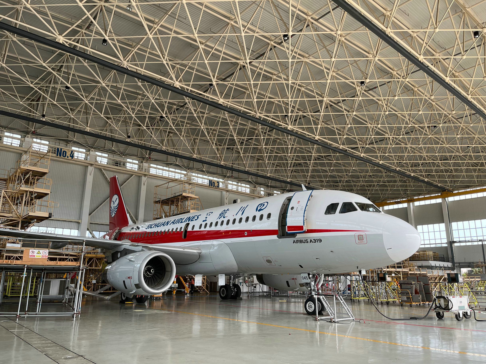 四川飞机维修工程有限公司机库内,一架正在维修的空客A319飞机(余如波 摄)