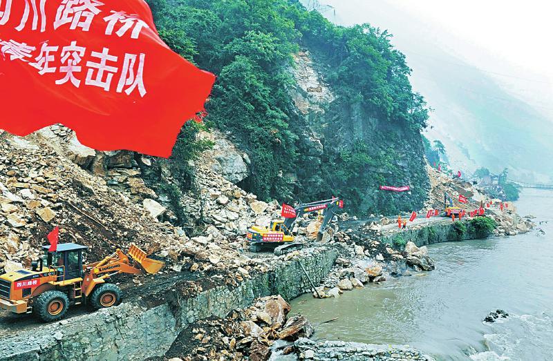 2008年“5·12”汶川特大地震发生后,蜀道集团奋力抢通国道213线都汶公路。 (拍摄于2008年7月30日)