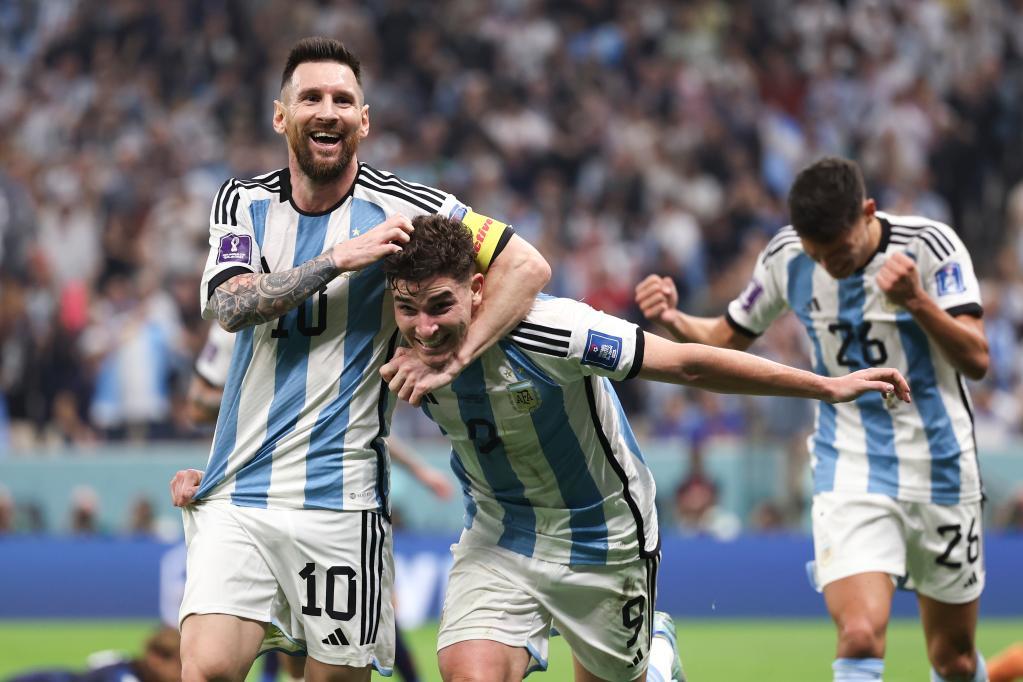 12月13日,阿根廷队球员阿尔瓦雷斯(前右)在比赛中进球后与队友梅西(前左)庆祝。新华社记者 徐子鉴 摄
