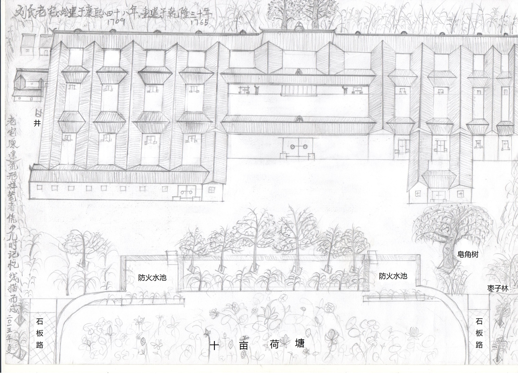 乾隆三十年(公元1765年),刘宗元重建祠堂。这次重建,规模宏大,手笔不凡,刘氏后人取名刘氏宗元祠。刘德忠绘出的格局图和讲述可以大致还原出近50年前祠堂周围的情况:祠堂前方建有10亩水塘,塘里种有莲荷。挨着水塘的是数百平方米的花园,植有兰草、菊花、腊梅、桂树等花草树木。后靠山丘,两旁为果林,苍翠繁茂,冬暖夏凉。