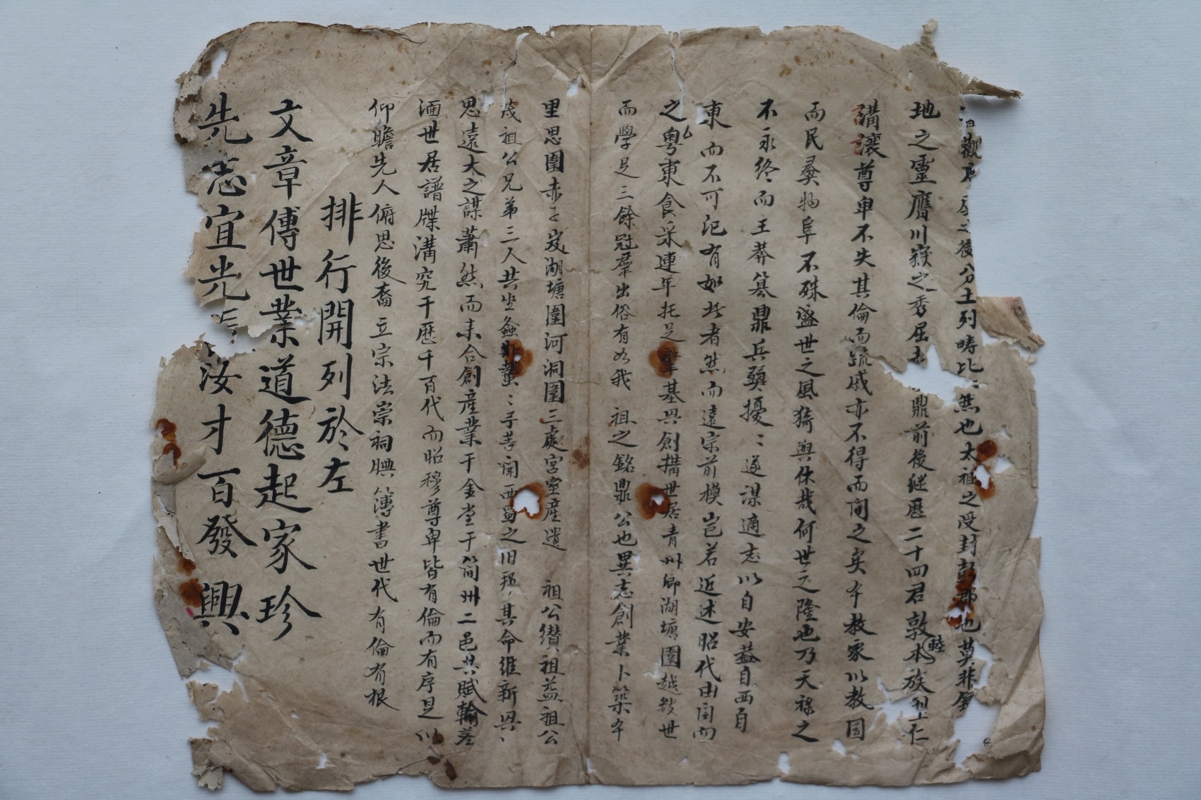 被刘德忠从火里抢救回来的《刘氏族谱》谱序残页,上面还有灼烧的痕迹。受访者供图