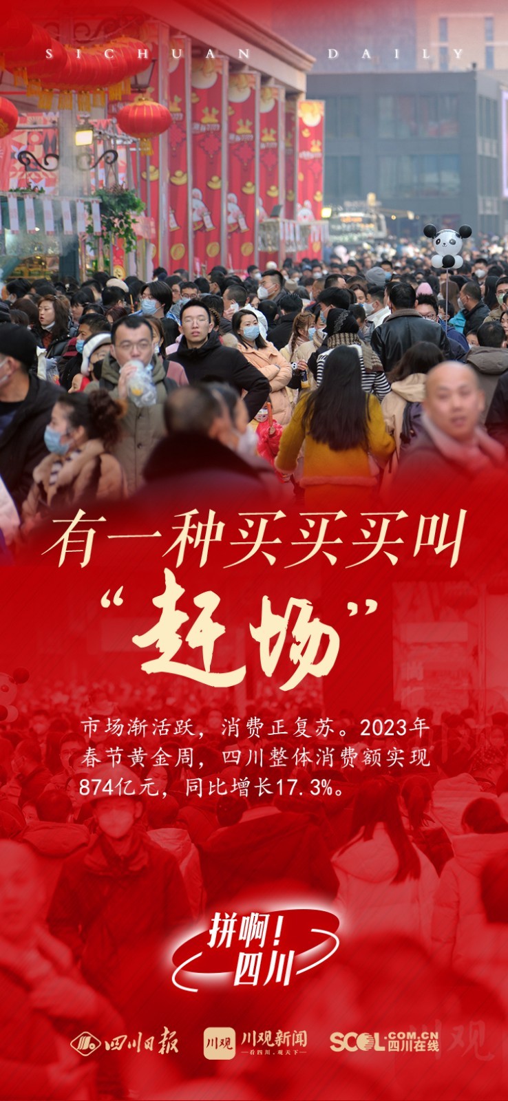 ▲据四川省商务厅公布的大数据监测情况,2023年春节期间(1月21日—27日),四川整体消费额实现874.0亿元,同比增长17.3%。(点击图片查看详情)