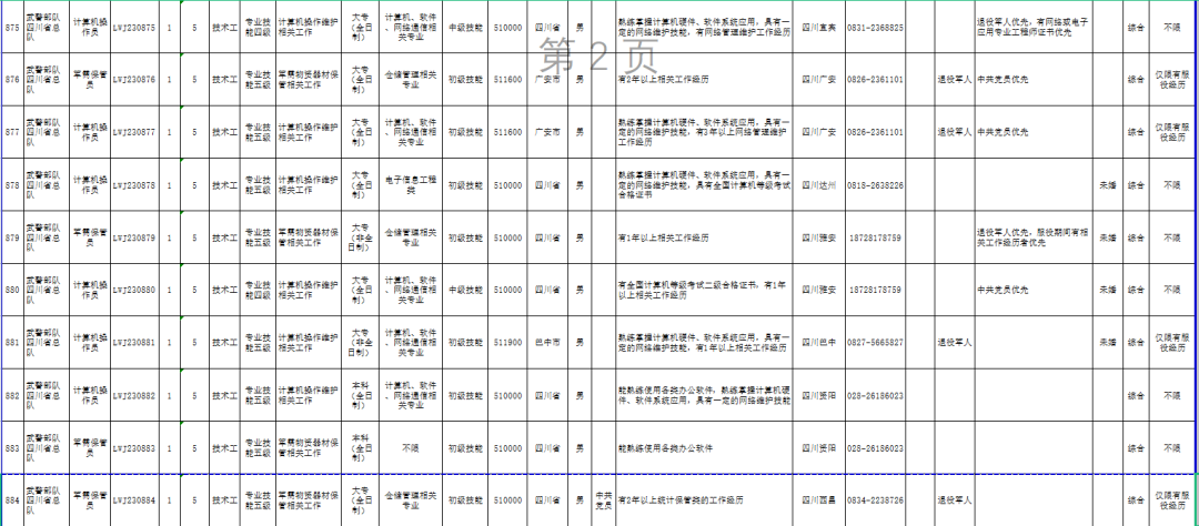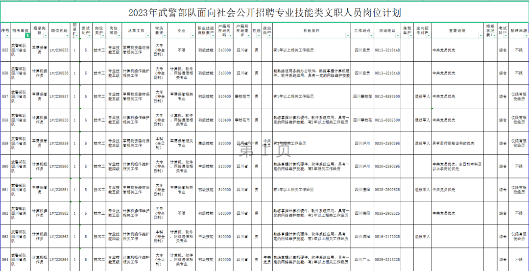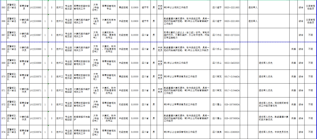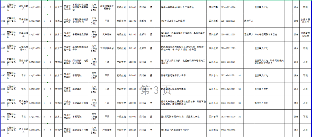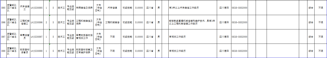 武警部队所属用人单位运输投送、装备维修、物资器材储存、军犬繁育、信息通信等专业技能三级以下文职人员岗位。