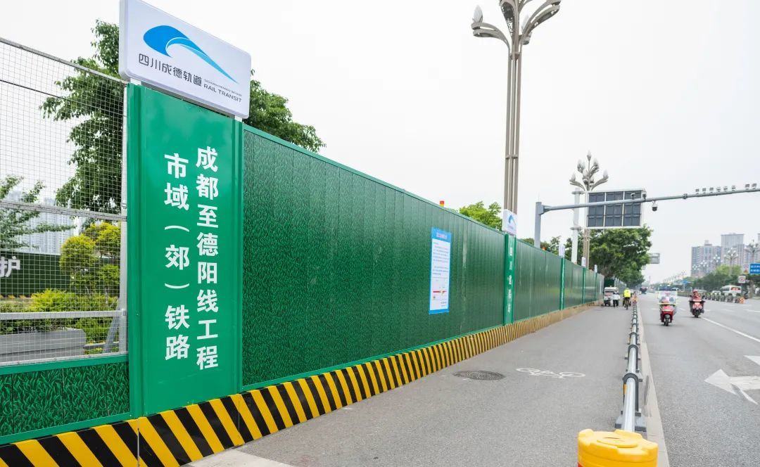 此次实施打围的工点为四川建院站,该站位于嘉陵江西路和泰山南路二段交叉口处,沿泰山南路二段设置,是成德线德阳段“入地”后的首座车站。此次实施打围的区域为泰山南路东侧绿化带及人行道,围挡紧贴人行道边缘敷设,最大程度降低对车辆通行的影响。