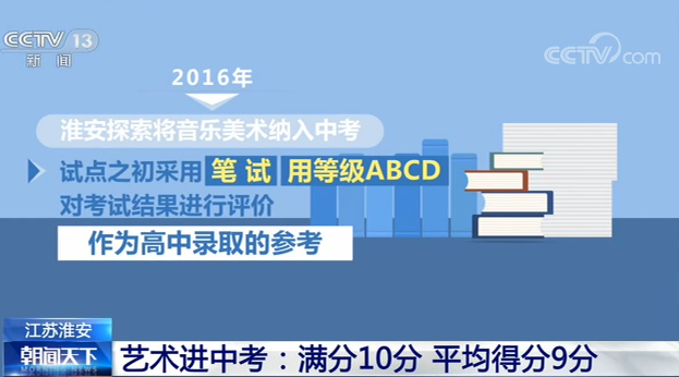 2016年,淮安探索将音乐美术纳入中考,试点之初采用笔试、用等级ABCD对考试结果进行评价,作为高中录取的参考。2018年,改革进一步深化,音乐、美术各以满分5分分值计入中考总分,共十分,考核内容主要是音乐、美术基本知识和基本素养,考试方式由笔试调整为人机对话考核,不再局限在基本知识,而是注重考察学生对音乐和美术作品等欣赏辨析能力。