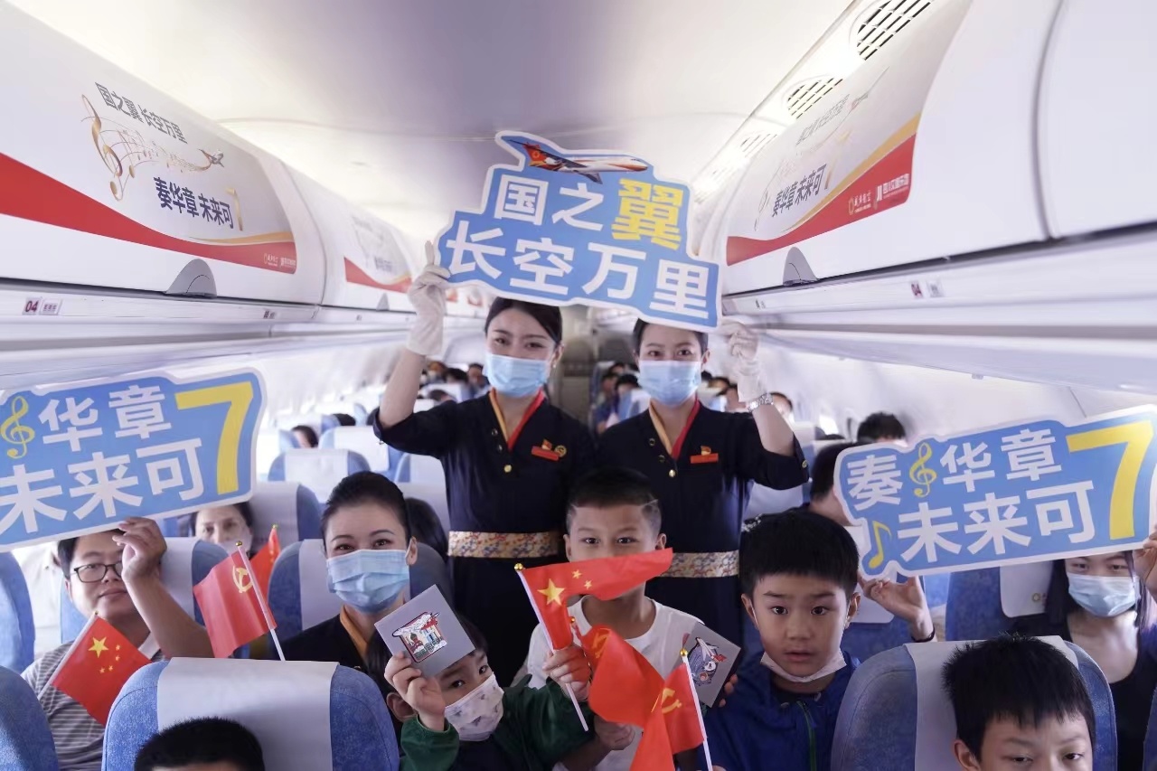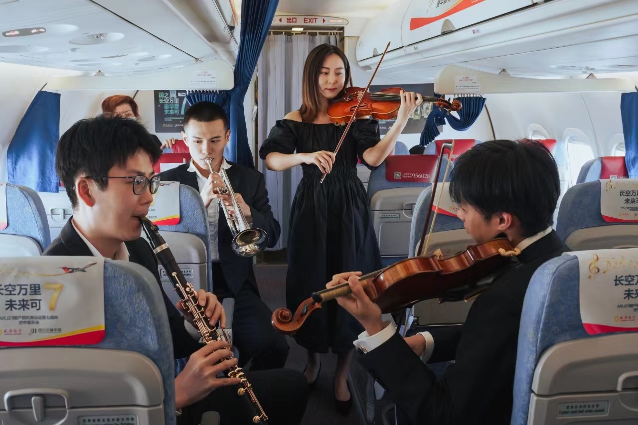 6月28日,一场以“国之翼长空万里 奏华章未来可“7”为主题的空中音乐会短视频在网络上线,成都航空特别携手四川交响乐团,在EU6671成都双流-岳阳-上海虹桥航班上联动,带来的一曲曲彰显民族文化自信的华美乐章。