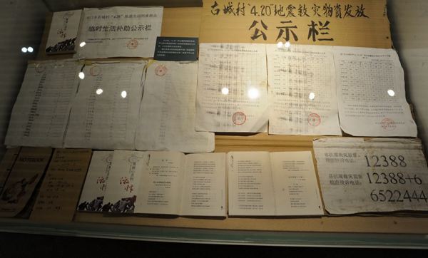 实物展示柜中,有一块从纸箱上撕下来的纸板,上写着“古城村‘4·20’地震救灾物资发放公示栏“的毛笔字,还贴有古城村物资发放明细账表。原来,在“4·20”芦山强烈地震后第二天,芦山县纪委在应急状态下,临时在各村帐篷前用纸板树起这样的牌子,对救灾款物管理、发放进行监督,同时公告群众,阳光救灾。