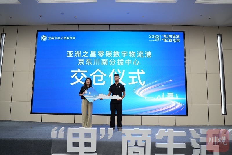 8月23日,在2023宜宾市首届新电商大会上,京东物流与宜宾五新城市建设有限公司负责人进行钥匙交接的交仓仪式,标志着京东物流川南分拨中心正式入驻宜宾亚洲之星零碳数字物流港。