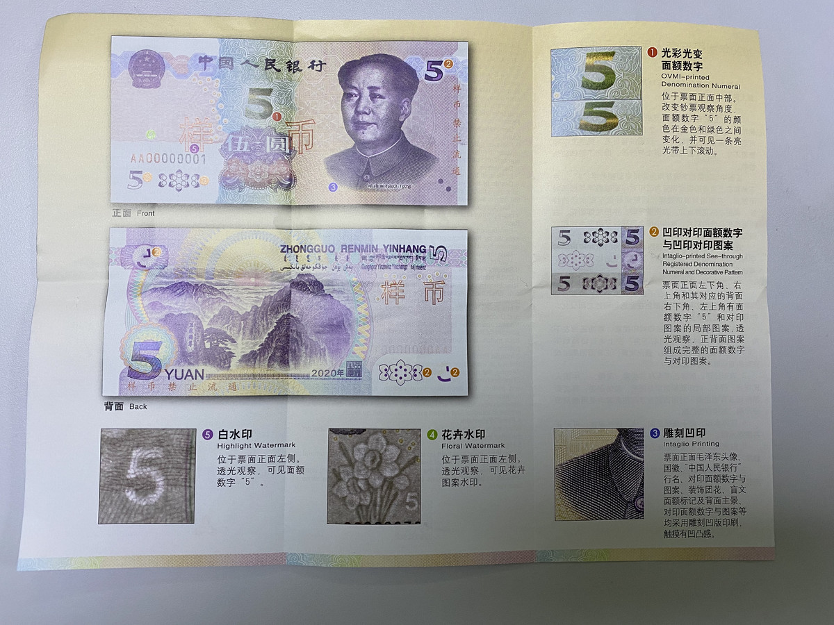 “2020年版第五套人民币5元纸币保持2005年版第五套人民币5元纸币规格、主图案、主色调、‘中国人民银行’行名、国徽、盲文面额标记、汉语拼音行名、民族文字等要素不变,优化了票面结构层次与效果,提升了整体防伪性能。”工作人员指着宣传手册上面的图一一解释给记者。