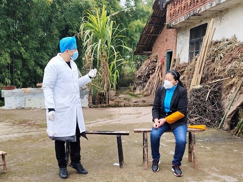 2月1日上午,不到一个小时,黄永剑已两次走进武汉返乡居家隔离观察人员刘大姐的家。第一次是上门监测体温,观察到她有些咳嗽,立马返回桥头镇卫生院汇报,第二次他又上门为其抽血检验。刘大姐看他一瘸一拐地走进门,赶忙去搀扶他坐下:“黄医生,你对我们太负责了,你自己腿脚都不方便,喊卫生院换个人来嘛。”黄永剑回答道:“我是共产党员,又是学医的,这个时候当然是我上。”