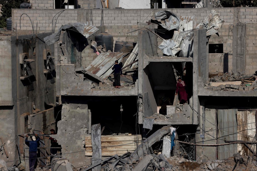 12月4日,在加沙地带南部城市拉法,人们查看被炸毁的房屋。