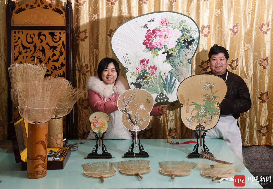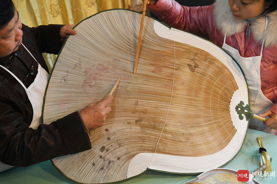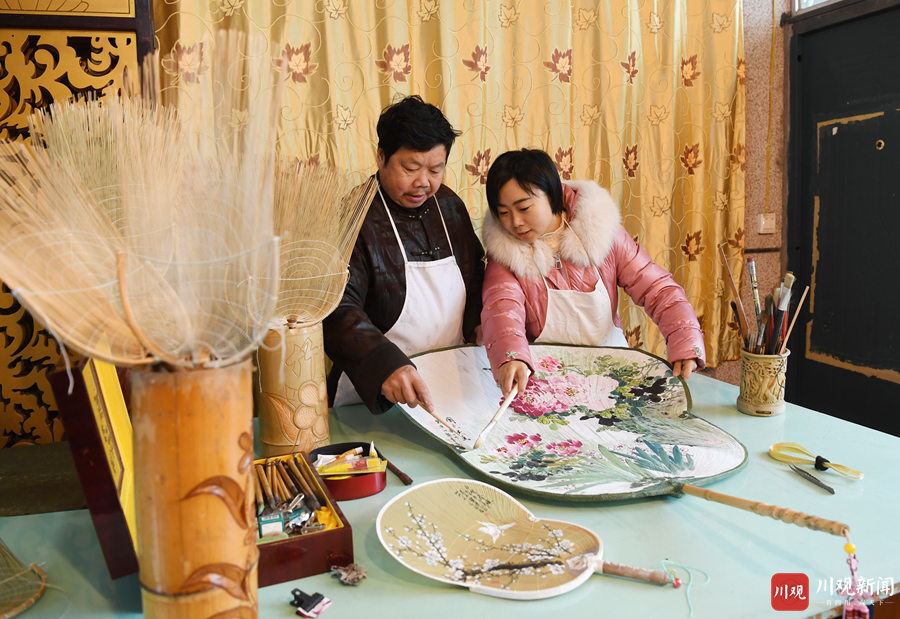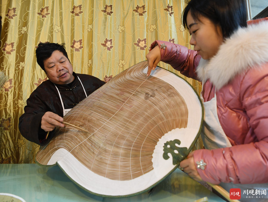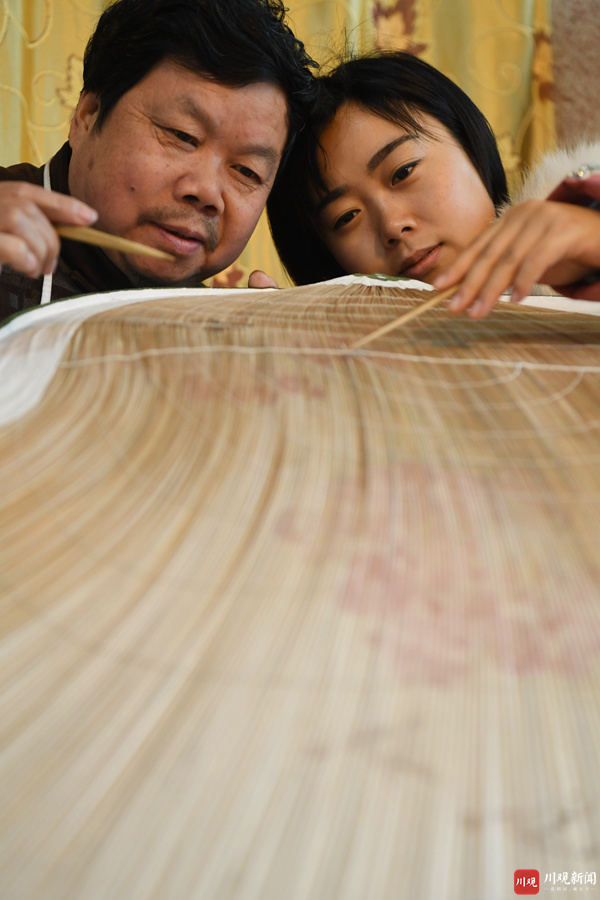 12月3日,在德阳潮扇传承人龚德江家中,他和女儿龚书正在对长1.2米、宽60厘米的“扇王”的扇面做精细化处理。这把以“国色天香”为主题的潮扇,是目前四川最大的一把德阳潮扇,将于本月底向大众展示它的真容。