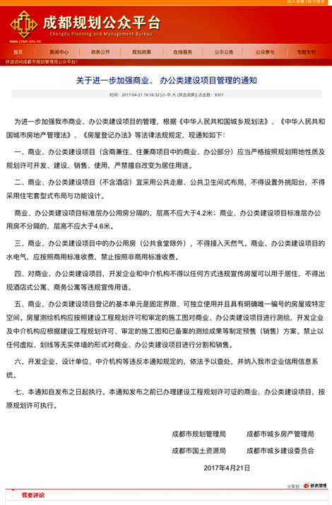 4月21日,成都市规划局、房管局等多个部门联合发布了《关于进一步加强商业、 办公类建设项目管理的通知》“以下简称《通知》”要求,商业、办公类建设项目(含商兼住、住兼商项目中的商业、办公部分)应当严格按照规划用地性质及规划许可开发、建设、销售、使用,严禁擅自改变为居住用途。