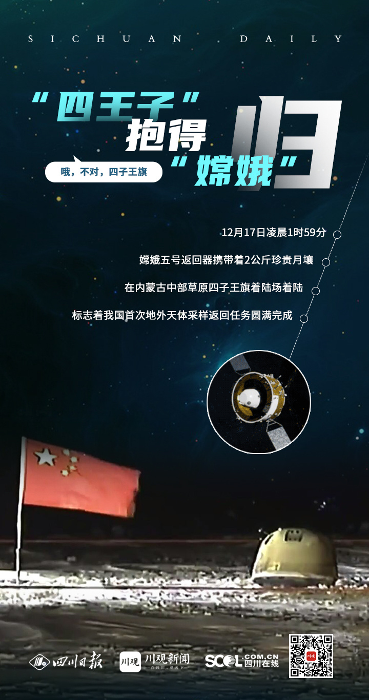 北京时间12月17日1时59分,探月工程嫦娥五号返回器在内蒙古四子王旗预定区域成功着陆,标志着我国首次地外天体采样返回任务圆满完成。