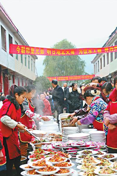去年冬天,即将告别故土的村民们聚在一起吃坝坝宴。 (资料图片)