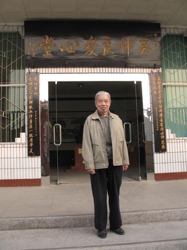 2006年,吴仲良老先生在他捐建的乐至“爱心堂”前留影