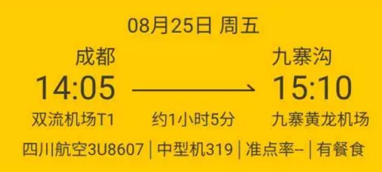 据了解,该航线班期为每周三班,分别于每周一、三、五执行,每天往返各1班,航班号3U8607/8,采用空客A319执飞。执飞时间为下午13时50分成都起飞,14时50分落地九寨;15时55分九寨沟起飞,16时50分落地成都。