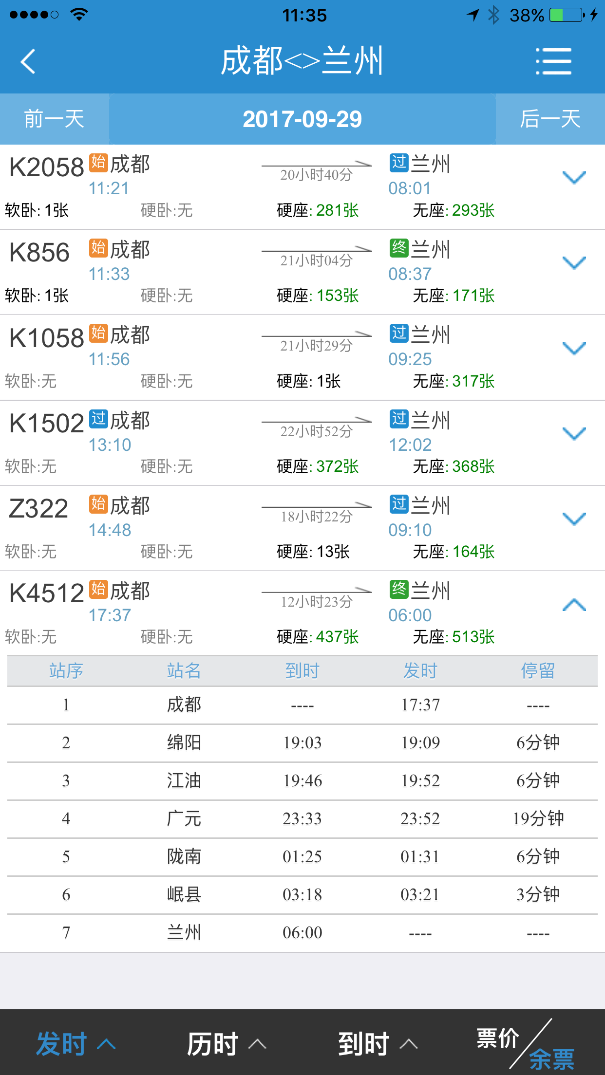 成都至兰州K4512/3次:成都17:37开、绵阳19:03到/09开、江油19:46到/52开、广元23:33到/52开、陇南次日1:25到/31开、岷县3:18到/21开、兰州6:00到;