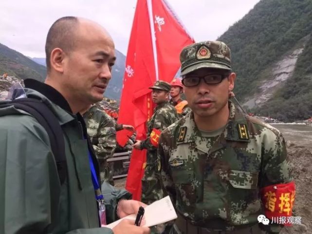 四川日报记者阮长安在茂县山体滑坡灾害抢险救灾现场采访。
