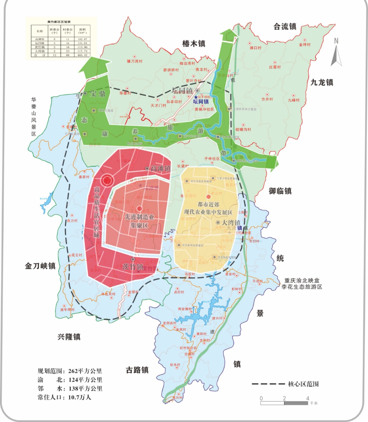根据方案,新区规划范围包括重庆市渝北区茨竹镇、大湾镇的部分行政区域和四川省广安市邻水县高滩镇、坛同镇的部分行政区域,总面积262平方公里,其中渝北区124平方公里、邻水县138平方公里,2019年常住人口10.7万、实现地区生产总值约45亿元。