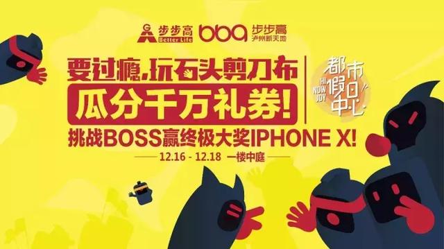 活动期间,无需任何消费即可参与最具国民基础的“石头剪刀布”三局两胜游戏!与吃喝玩乐购五大类目的BOSS们真人PK石头、剪刀、布数不清的奖品等你来赢!