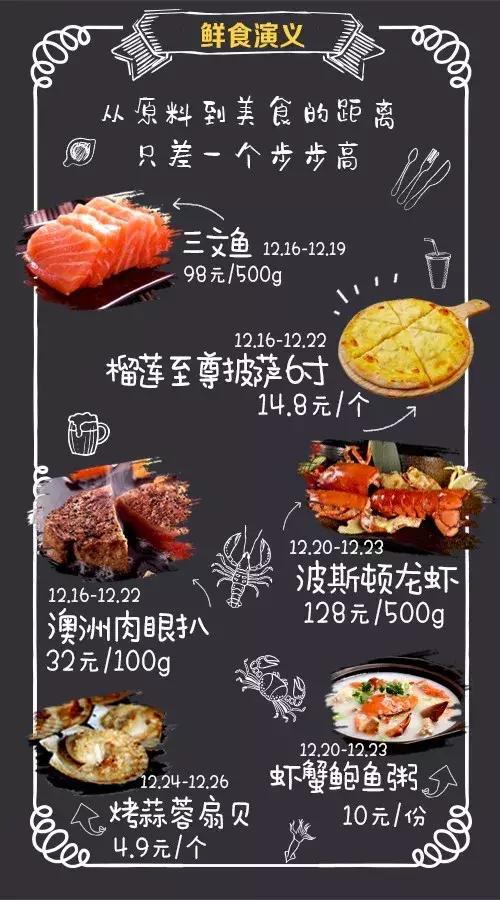 鲜食演义在湖南已有16家步步高超市在运营,进入四川尚属首次。该项目的特点是将餐饮引入超市生鲜区,消费者购买了帝王蟹、大闸蟹、波士顿龙虾、三文鱼等海鲜以及牛排等生鲜产品,可以直接在超市内加工并食用,该项目被称为中国超市版的共享厨房。