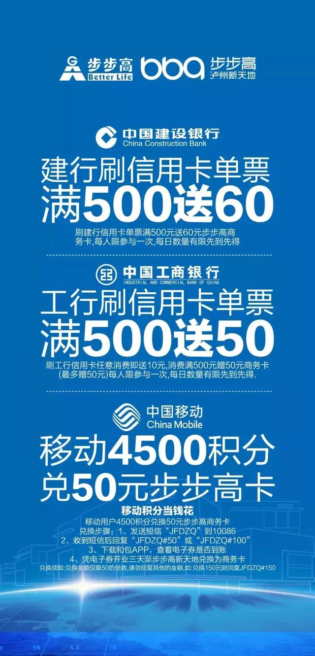 活动期间,凡在步步高泸州新天地刷建行信用卡单票满500即送60元步步高商务卡(限步步高超市使用)。