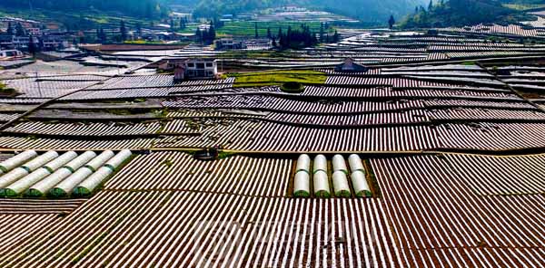 4月7日,枧槽苗族乡长秧村万亩烟床如巨幅的钢琴按键奏出春天的序曲。