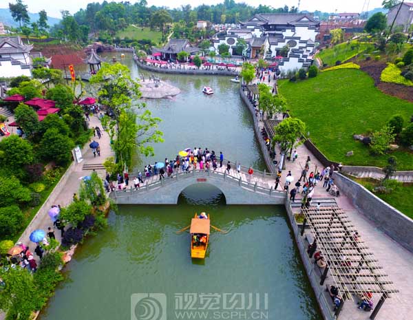 4月30日,游客在江门镇桃花坞泛舟享受川南水乡。