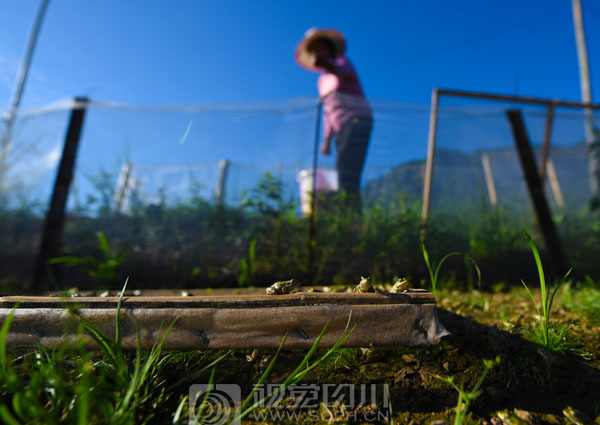 6月5日,叙永镇宝元村引进稻蛙生态养殖项目,农户向稻田边上的青蛙喂食。