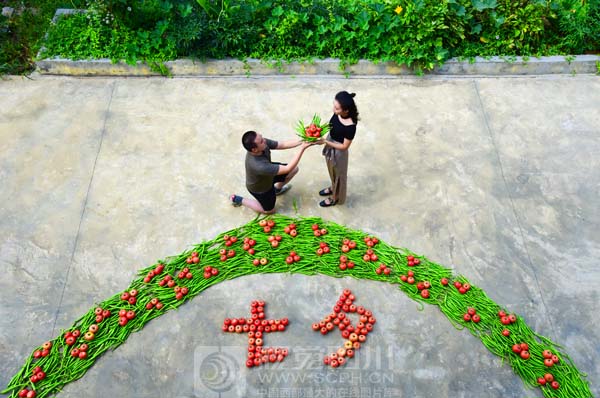 8月28日,七夕节,麻城镇麻城村高山蔬菜基地,参加“浪漫采摘”活动的情侣在“蔬菜鹊桥”旁表达爱意。