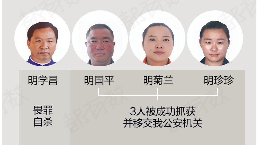 2023年11月,中国警方派出专案组,冒着战事风险赴缅甸果敢取证。当月12日,浙江温州公安机关依法对犯罪集团重要头目明学昌、明国平、明菊兰、明珍珍4人公开悬赏通缉。15日,明学昌在面临抓捕时畏罪自杀身亡。第二天(11月16日),其子明国平、其女明菊兰和孙女明珍珍3人被成功抓获并移交中方。