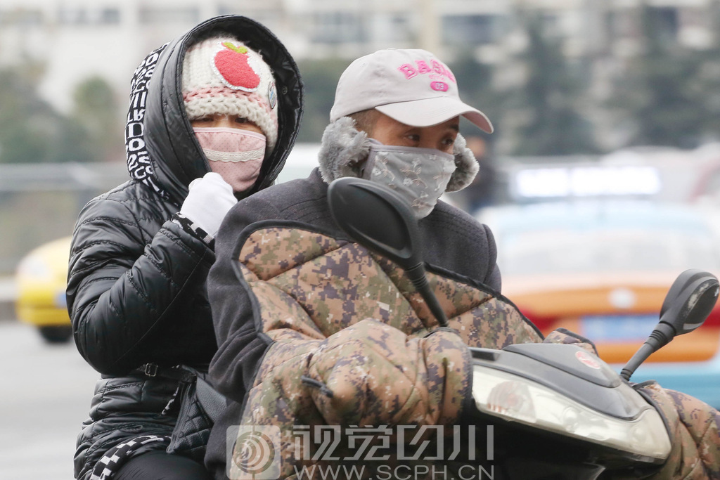 2018年1月3日绵阳气温骤降,行走在城区街头的市民全副武装抵御低温。陈冬冬 摄