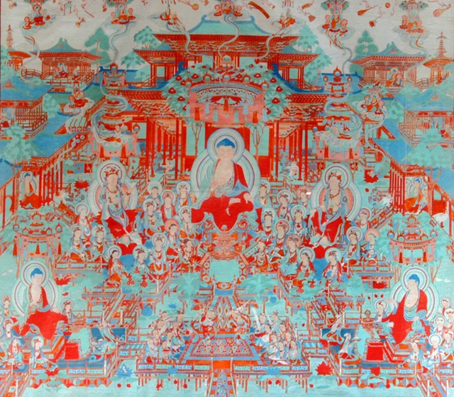 此次亮相国博展出的《观无量寿经变》,是张大千临摹敦煌壁画中人物最多的一幅。在经变故事的“极乐世界”中,有微波荡漾的莲池、有庄重华丽的楼阁亭台。无量寿佛端坐中央,两侧及廊阁是诸佛及诸菩萨。整幅画作构图紧凑严密、层次有序、宏伟壮观;人物超过百人,各具仪态。粉绿、朱红的基调,令画面色彩对比强烈,摄人心魄。四川博物院首席专家魏学峰说,这幅画还精细描摹了近50种唐代乐器,对研究唐代音乐史也有很大帮助。