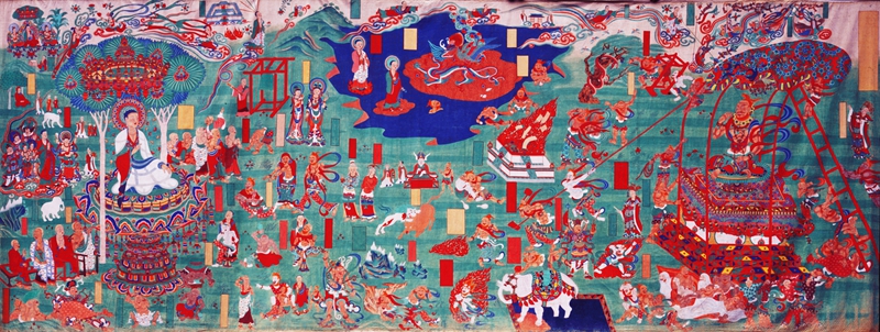 四川博物院典藏部主任彭代群说,《晚唐劳度叉斗圣变》临摹于敦煌莫高窟第196窟西壁南北两侧,它长9.25米,高3.45米,是晚唐壁画最大、最完整的一幅。在约30平方米的画布上,张大千还原了壁画庞大的场景和丰富的细部,着色饱和,以红、绿、蓝、白为主,华美绚目,令人震撼。