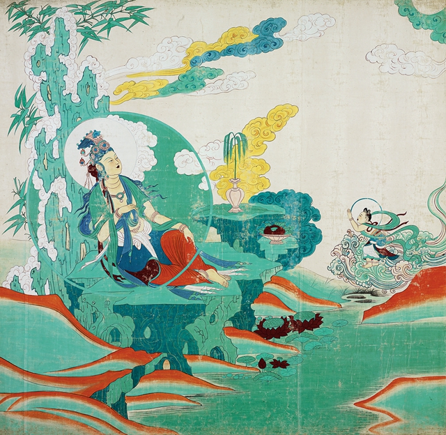 魏学峰说,张大千在成都举办敦煌临摹画展以后,因为喜欢《水月观音像》,又在1945年重新创作了一幅。画作一出,达官显贵、字画藏家争相购买。当时的四川省教育厅厅长郭有守觉得这样一幅重量级作品私藏实在可惜,于是建议四川省政府主席张群,请出画家姚石倩牵头买下这幅画,后来画作珍藏于新都宝光寺。
