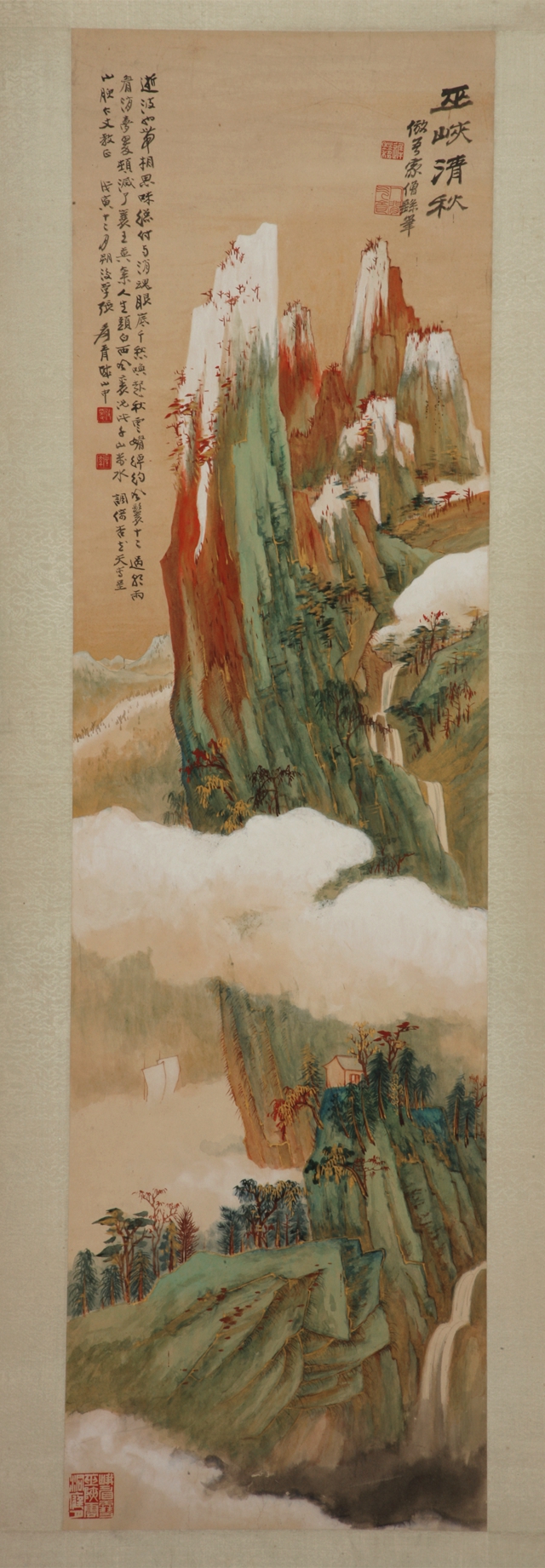 在国博的张大千艺术展上,来自川博的《巫峡清秋图》,与荣宝斋的《华山云雨图》一起,成为张大千金碧山水的代表。1938年,张大千回到成都,举家前往青城山居住。此后十年,除了敦煌时期,青城山是他的主要居住地之一。清幽的山居生活和美景,孕育了不少传世佳作。这幅《巫峡清秋图》便创作于青城山。张大千在题款上写道,“调寄杏花天,写呈山腴仁丈教正”,可见他与林山腴等文人雅士的交集。