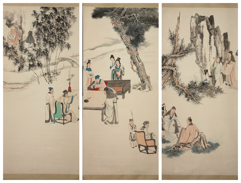 四川省文化馆:珍藏了张大千1944年创作的《金碧山水图轴》《临管仲姬竹窝图横批》《松下弹琴图》《朱荷图轴》以及1945年创作的《临南唐顾闳中斗鸡图轴》等。