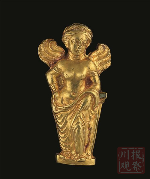 由于大月氏与邻国的往来较为频繁,在蒂拉丘地除了发现有大量游牧民族的文化元素外,文化交流的痕迹也在蒂拉丘地表现得十分显著。本单元展品中,有一尊黄金制成的“阿芙洛狄特金饰”。