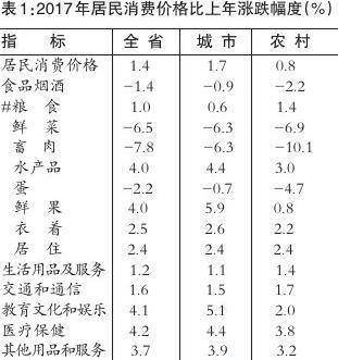全年居民消费价格(CPI)比上年上涨1.4%,其中教育文化和娱乐类上涨4.1%,医疗保健类上涨4.2%,居住类上涨2.4%。商品零售价格比上年上涨0.5%。农业生产资料价格比上年下跌0.2%。工业生产者出厂价格(PPI)比上年上涨6.5%,其中生产资料价格上涨8.7%,生活资料价格上涨0.8%;工业生产者购进价格(IPI)比上年上涨8.3%。