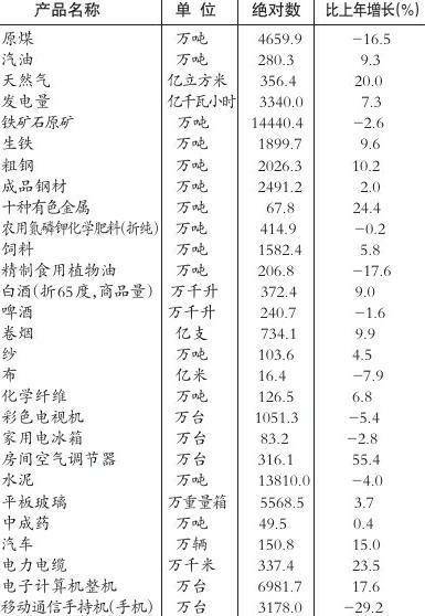 从主要产品产量看,原煤产量比上年下降16.5%,汽油增长9.3%,天然气增长20.0%,发电量增长7.3%,铁矿石原矿下降2.6%,成品钢材增长2.0%,水泥下降4.0%,白酒增长9.0%,汽车增长15.0%,电力电缆增长23.5%,电子计算机整机增长17.6%。全年规模以上工业企业产销率为97.3%。
