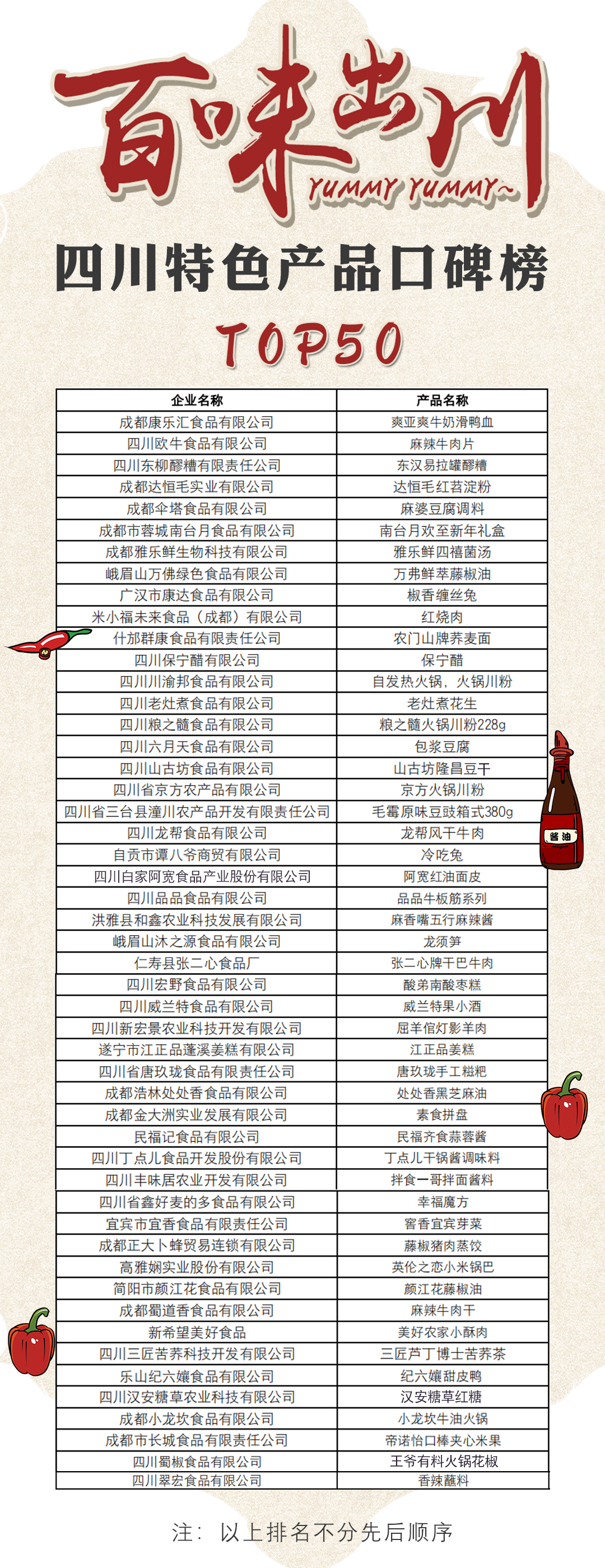 专家团根据行业观察、数据分析的基础出发,从人均消费金额、品牌分布区域、市场关注度、品牌建设、口碑表现等方面进行横向综合比较,最终根据投票情况综合评选出“百味出川”四川特色产品口碑榜TOP50。