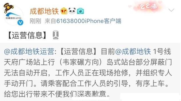 5月17日8:30分,记者从成都地铁运营公司获悉,1号线天府广场部分屏蔽门无法自动开启,正由专人手动开门保通行,目前地铁运营正常。