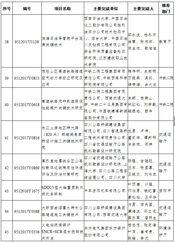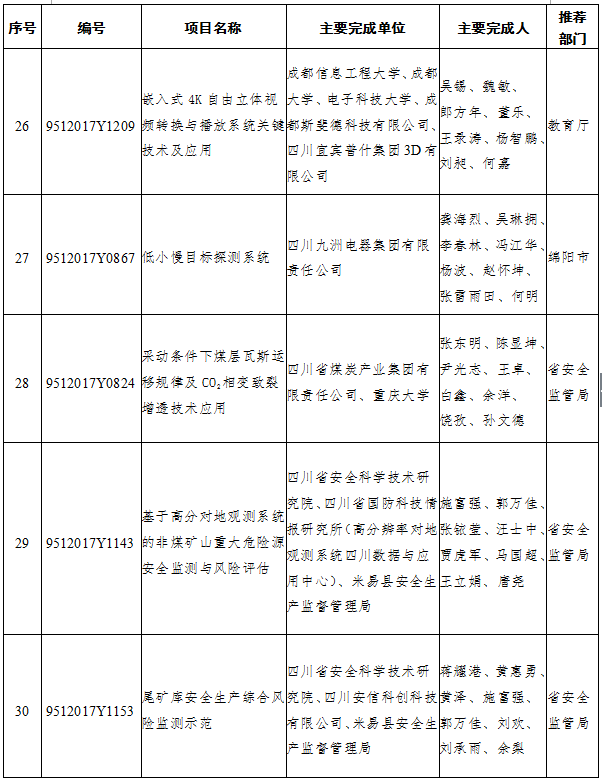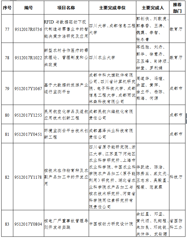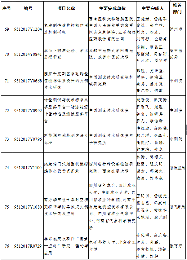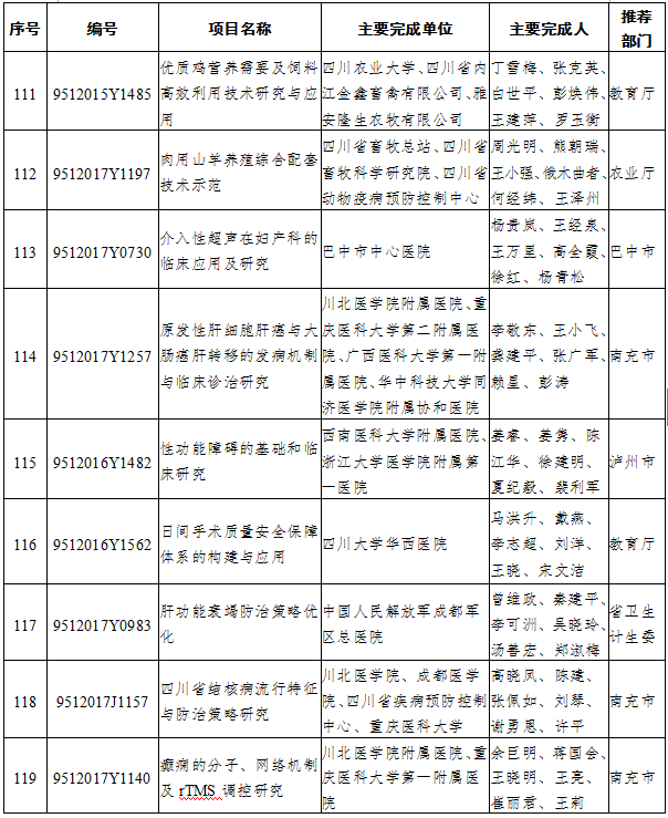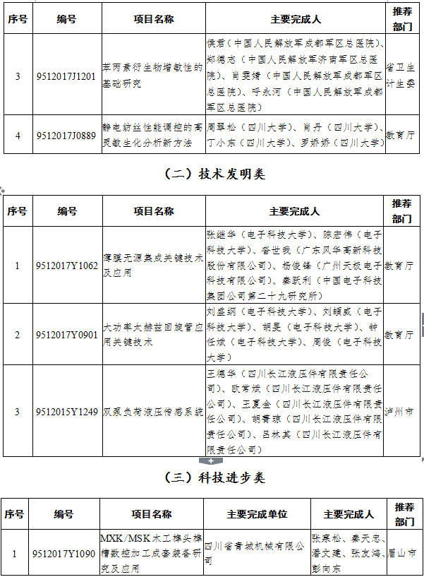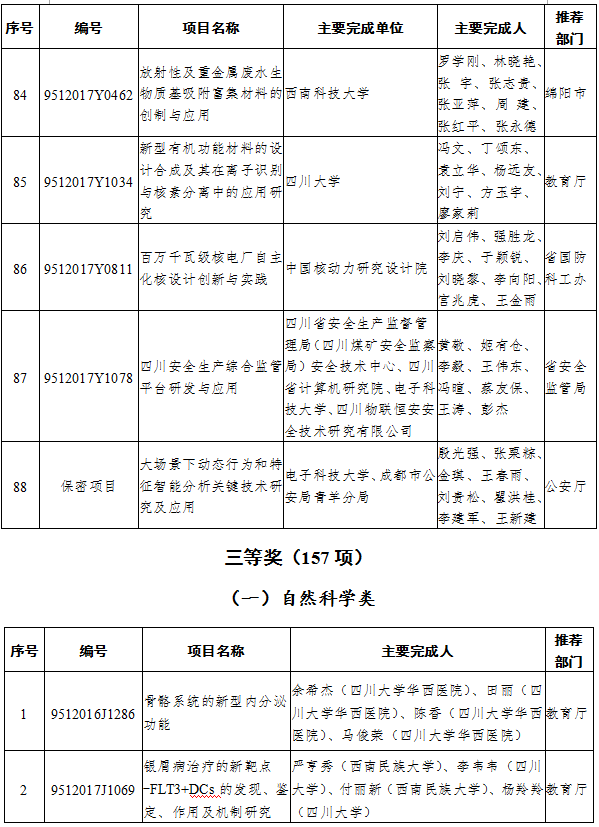 5月29日,记者从四川省政府网站获悉:根据《四川省科学技术奖励办法》,经省科学技术奖励评审委员会评审,省科学技术奖励委员会审定,省政府决定授予四川大学王玉忠教授四川省科技杰出贡献奖;授予“磁共振脑网络成像新方法及其对癫痫脑机制的研究”等31项成果四川省科技进步奖一等奖,授予“深部岩体工程特性测试技术及应用”等93项成果四川省科技进步奖二等奖,授予“FMS63柔性制造系统”等157项成果四川省科技进步奖三等奖。